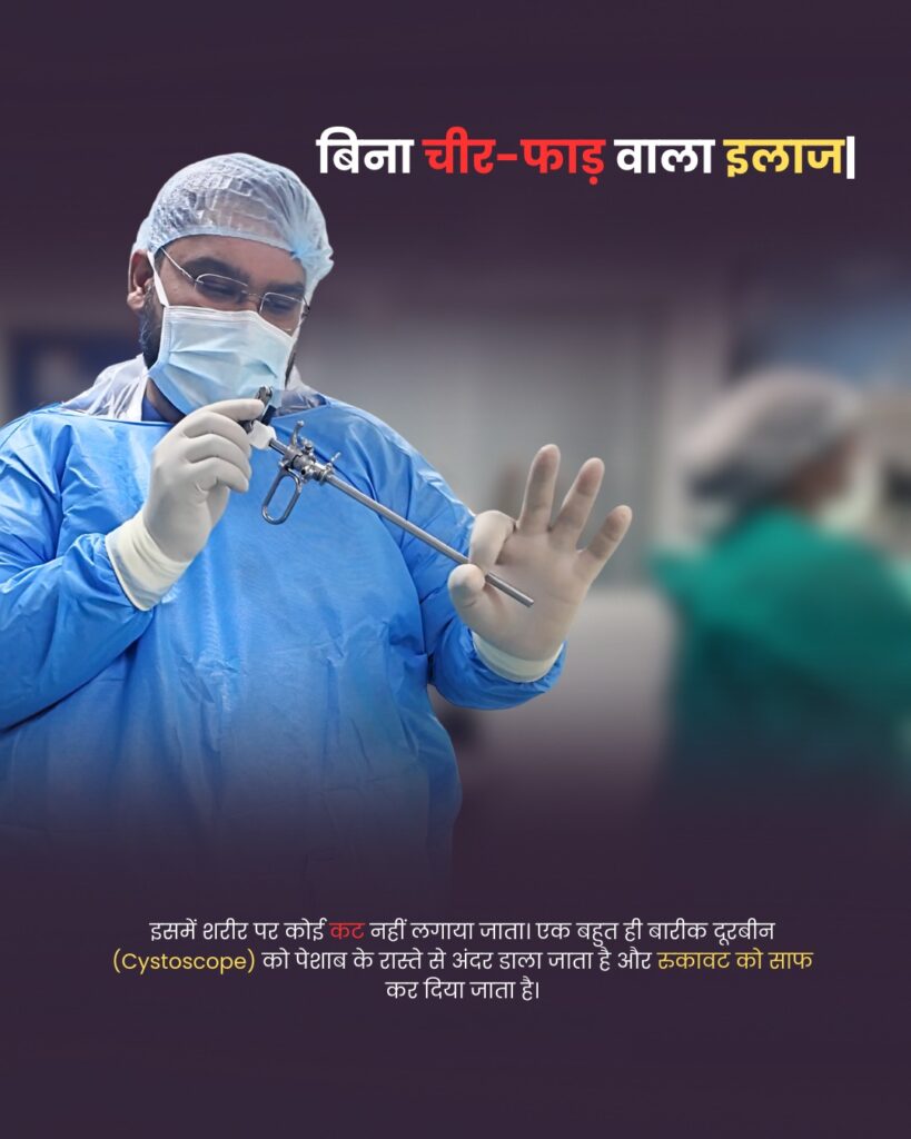 एक बहुत ही बारीक दूरबीन (Cystoscope) को पेशाब के प्राकृतिक रास्ते से अंदर डाला जाता है और जहाँ रुकावट होती है, उसे साफ कर दिया जाता है।