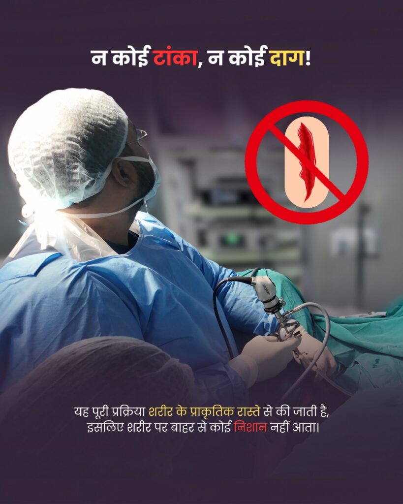 चूंकि यह पूरी प्रक्रिया शरीर के प्राकृतिक मार्ग से की जाती है, इसलिए सर्जरी के बाद शरीर पर कोई टाँका नहीं आता और न ही कोई दाग रहता है।